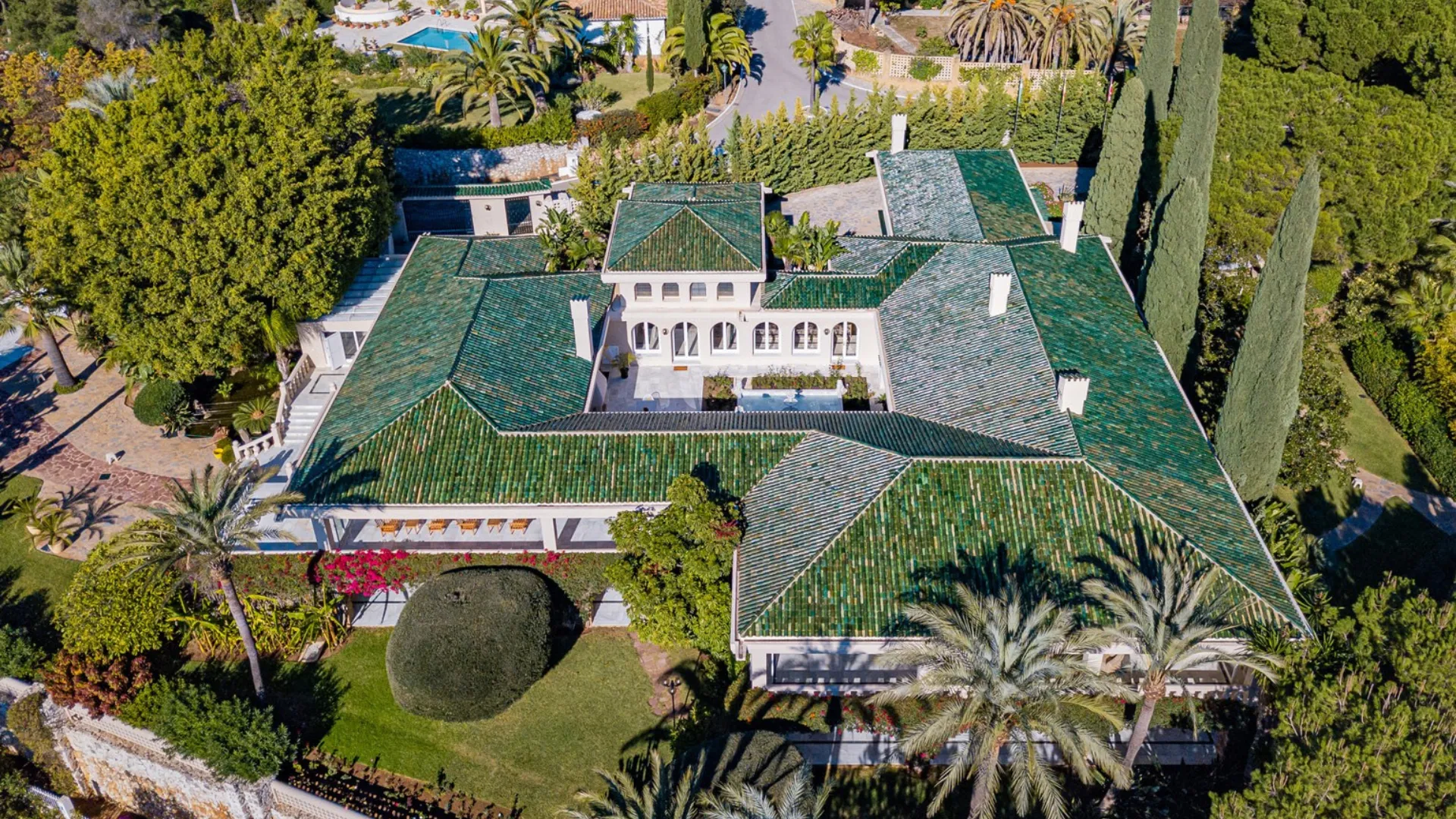 This property is a breathtaking south-west-facing oriented villa situated in Marbella. It features panoramic views over the stunning Rio Real Golf course, and the Mediterranean shoreline. Situated within 8,100 m² of plot area, it serves landscaped gardens, the villa features two swimming pools, and a lake.