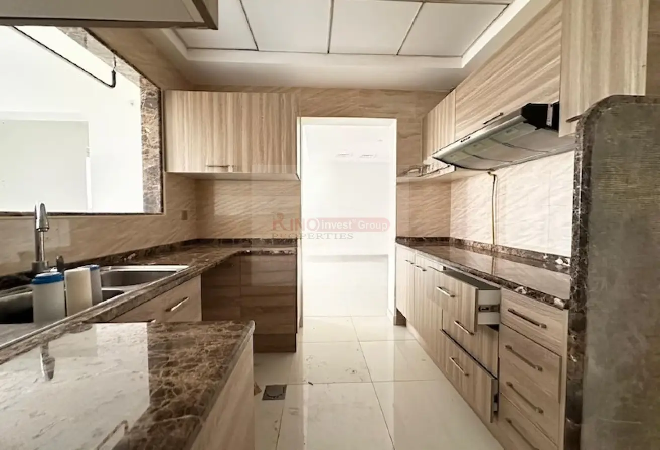 Each of the three master bedrooms includes built-in wardrobes and en-suite bathrooms that are fitted with luxury fixtures, offering style and functionality. The spacious living and dining area opens out to a private balcony, creating the perfect ambiance for entertainment or pure relaxation. A contemporary, fully fitted kitchen presents a sleek and efficient cooking environment, while a separate maid‘s room with bathroom adds to the functionality of the house.