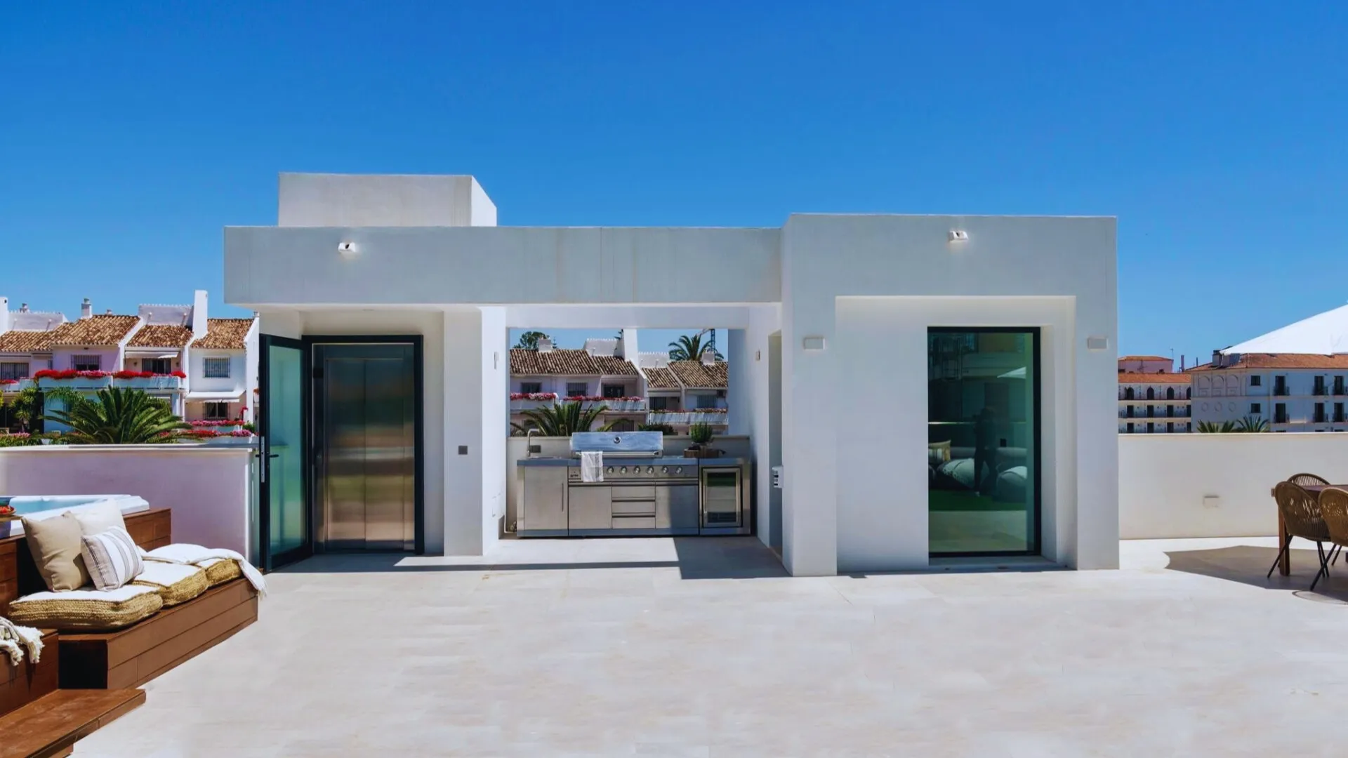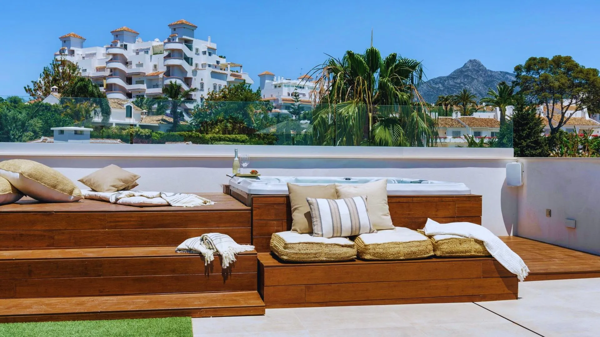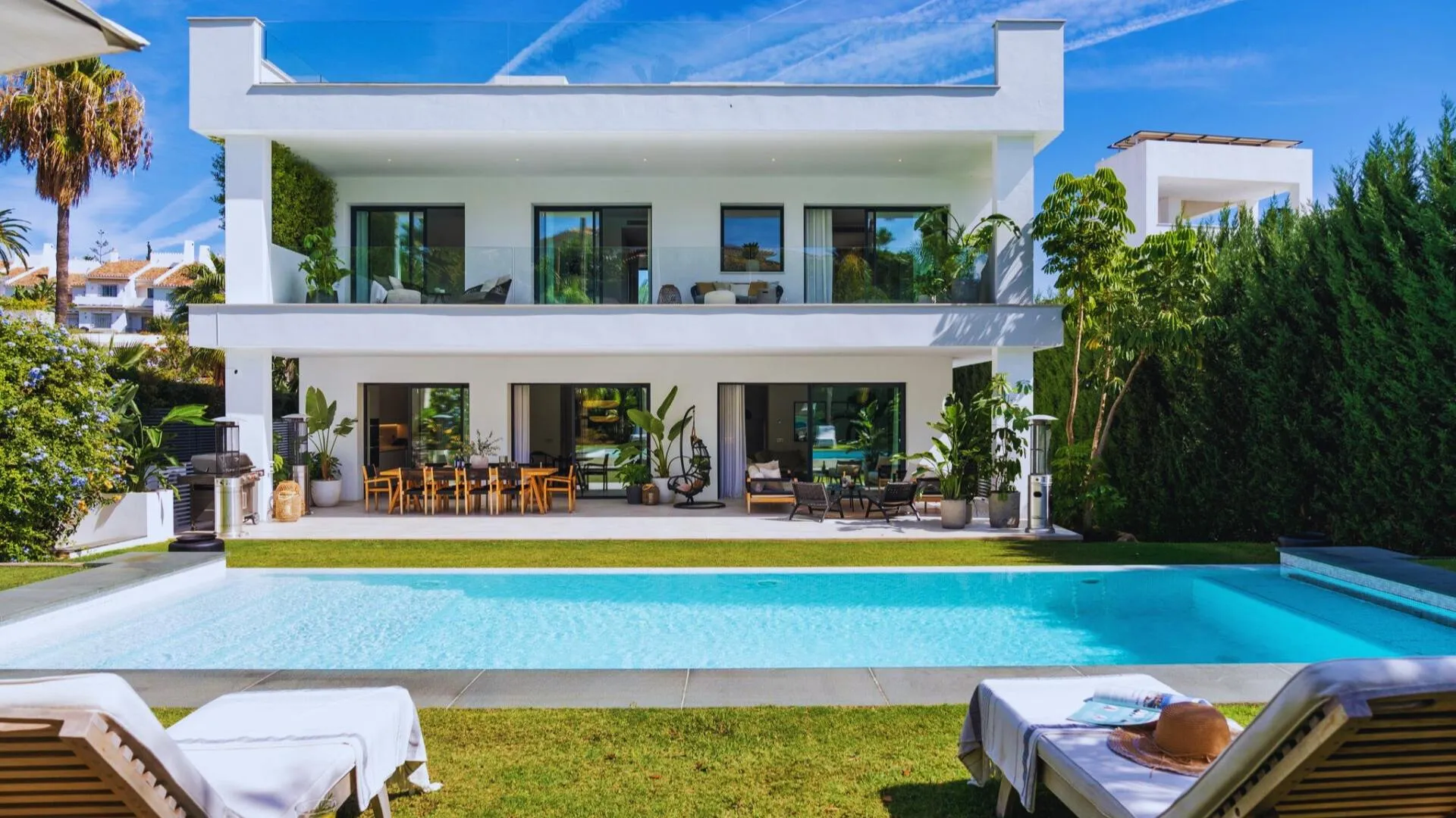 Layout: 5 bedrooms, 5 bathrooms and additional 2 guest bathrooms Size: The property built area of 606 m2 on a 1002 m2 plot Modern Amenities: Private jacuzzi, spacious rooftop terrace and top-tier Miele appliances. Private Oasis: The garden is a private oasis, featuring a heated saltwater pool surrounded by lush greenery, providing both privacy and tranquillity. Strategic location: One of the most appealing aspects of this property is its prime location. Upscale lifestyle. The area features a mix of modern and traditional architecture. Upscale Amenities: Residents can enjoy a range of amenities, including high-end shopping at the El Corte Inglés and the Marina Banus Shopping Center.
