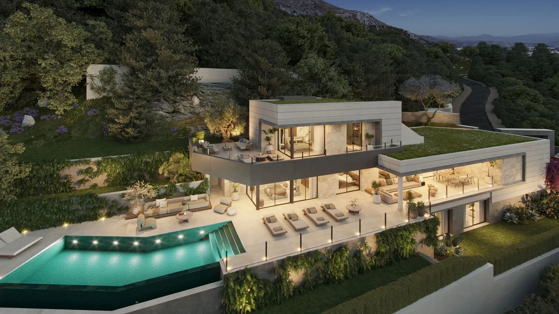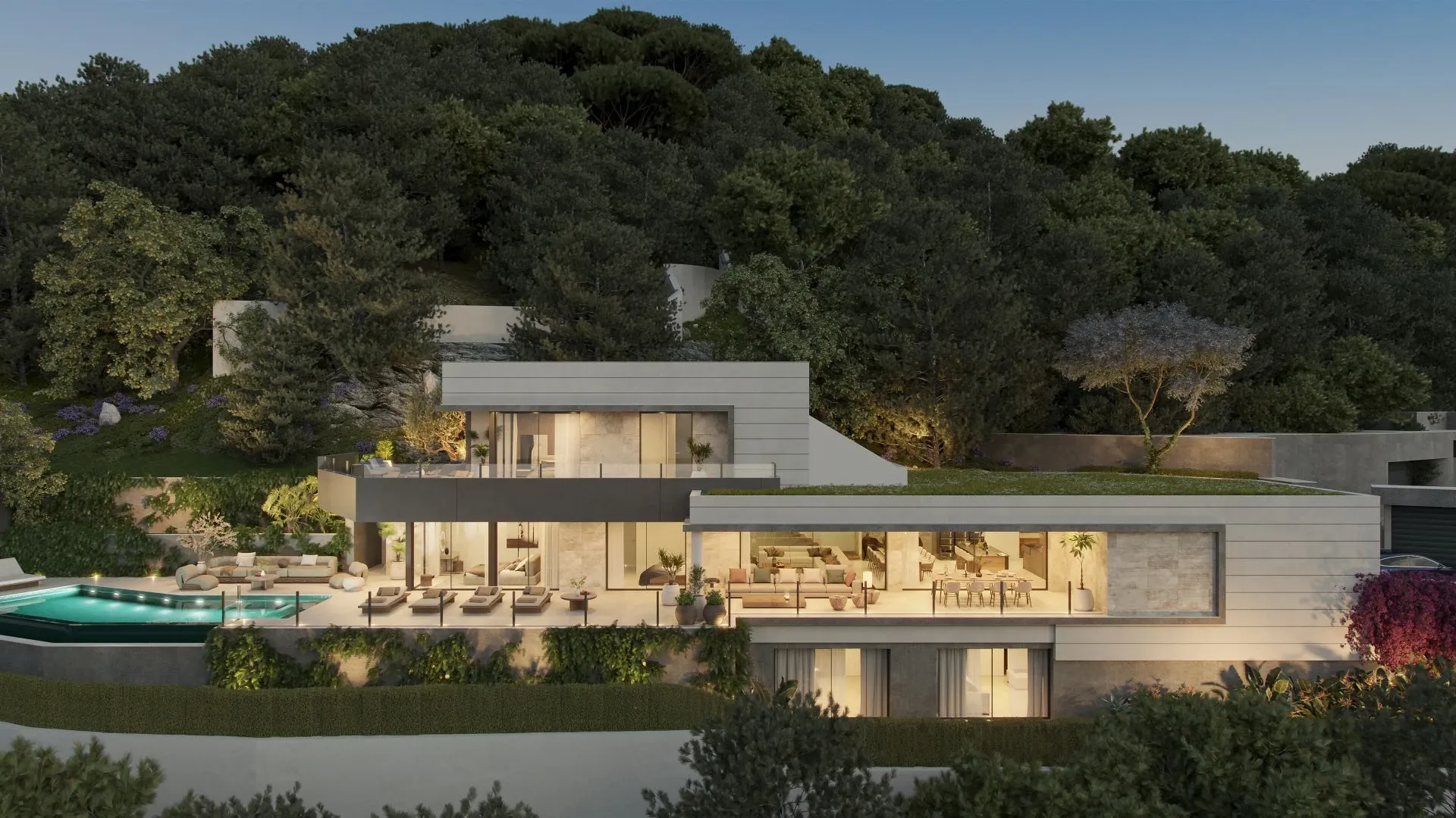 The villa features five stylish bedrooms and five modern bathrooms, designed with both aesthetics and comfort in mind. The spacious living room, adorned with expansive sliding glass doors, opens onto a terrace offering breathtaking panoramic views of the surrounding landscape. The outdoor area is equally impressive, featuring a private saltwater infinity pool, extensive south-facing terraces, and beautifully landscaped gardens. The property also includes five dedicated parking spaces, ensuring convenience for residents and their guests.
