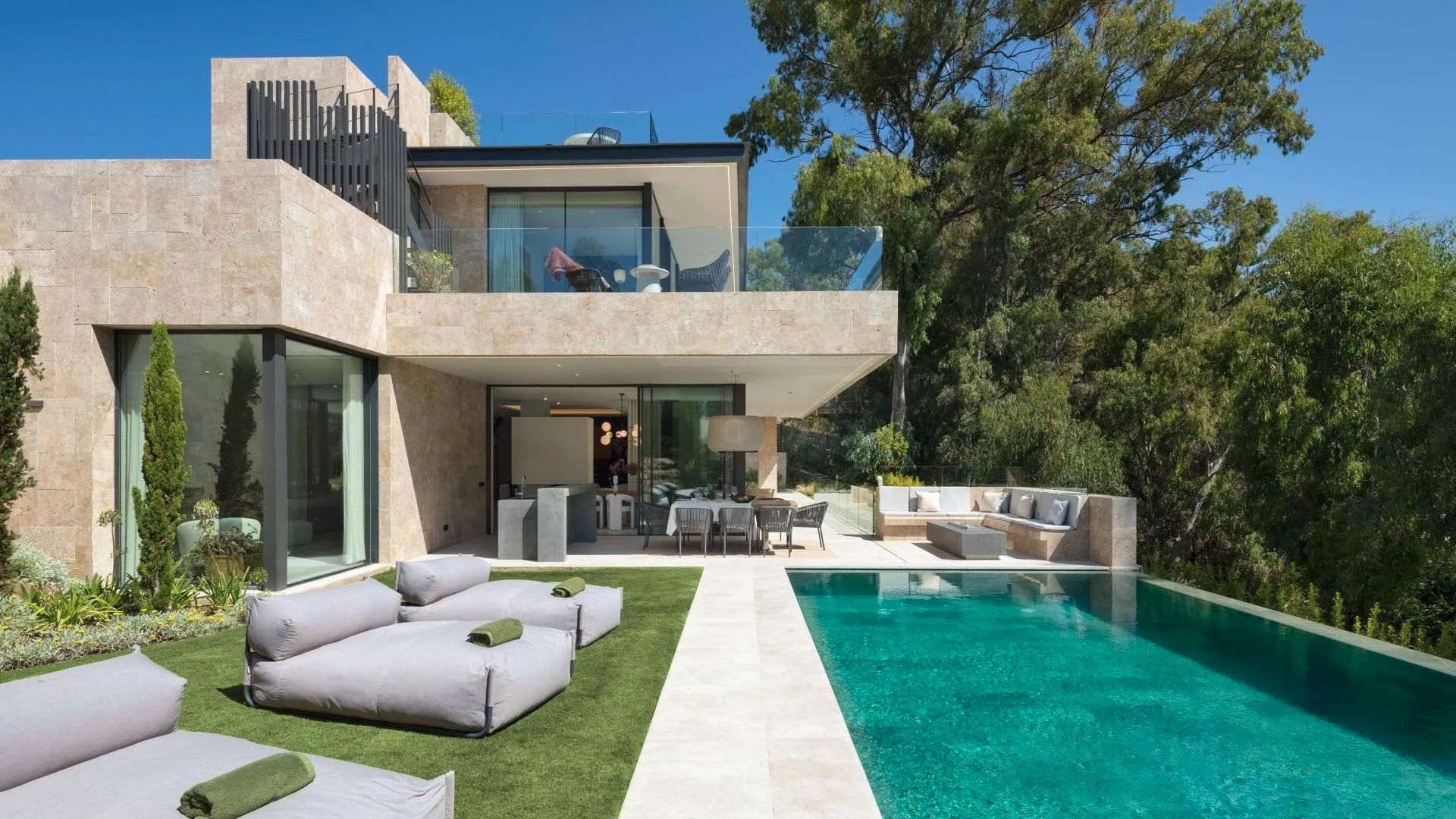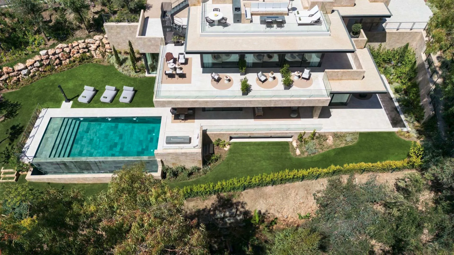 Villa Selene is crafted from natural materials to blend seamlessly with the surrounding landscape, creating an oasis enveloped in lush greenery.\nThe ground floor includes a living room, open-plan kitchen, dining room, TV room/office, and one en-suite bedroom. This floor extends effortlessly to the terraces, featuring an outdoor kitchen, living area, dining area, and pool area. The first floor boasts a master bedroom with a walk-in closet and two additional en-suite bedrooms. The rooftop terrace offers seating areas, a fire pit, a jacuzzi, and provisions for another outdoor kitchen. The basement includes a TV room with pre-installed kitchenette connections, providing extensive customization options. It also hosts a games room, gym, spa with a sauna and Hammam, one en-suite bedroom, and an additional bedroom/office that shares a bathroom with the gym area. The basement’s bedroom and TV room come with pre-installed kitchenette connections, offering further customization options. The villa allows for flexible remodeling of the top floor to suit your preferences.