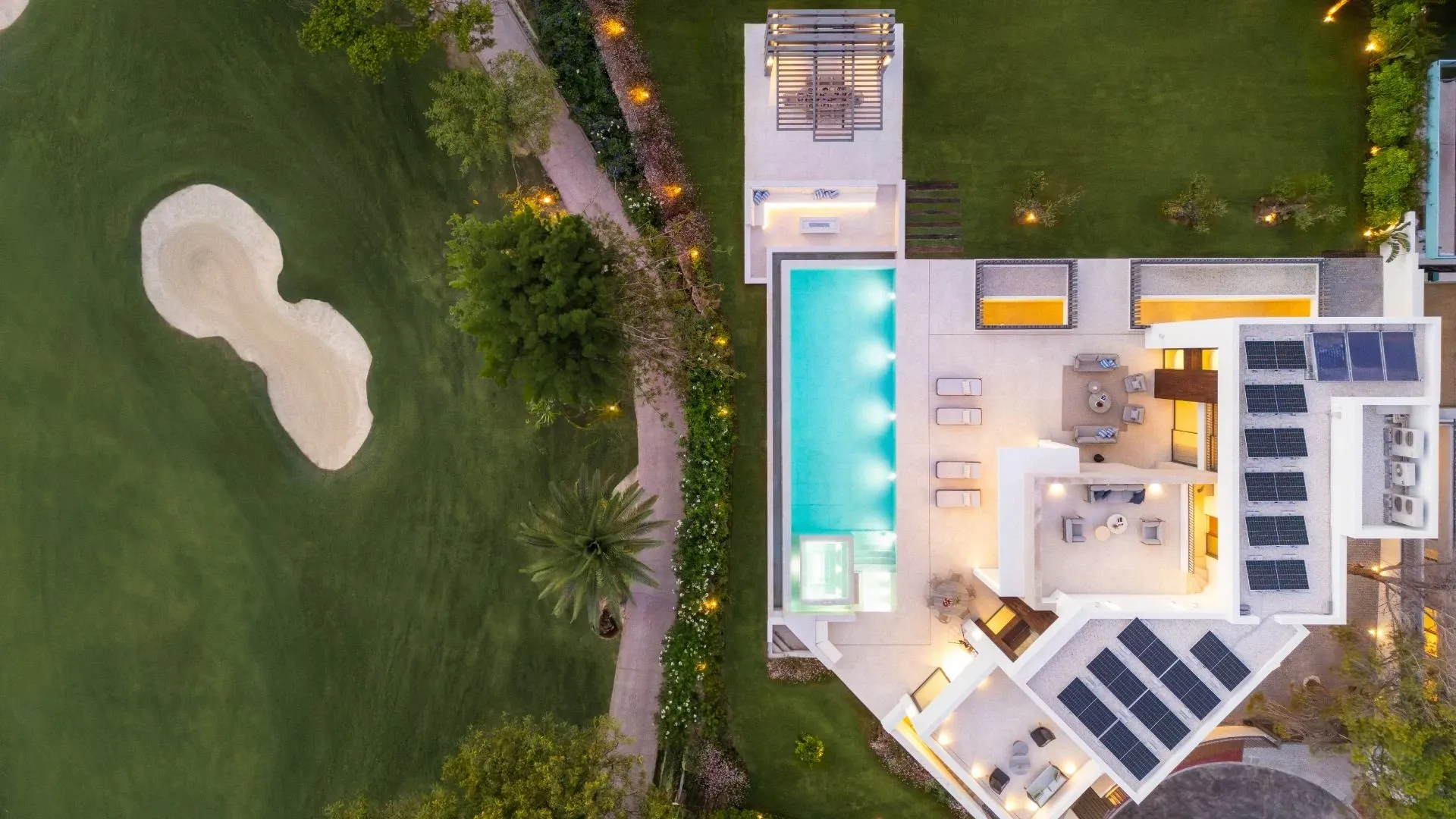 The villa offers a spacious and open-plan layout, featuring five bedrooms, each with its en-suite bathroom. The interior is designed with high-quality materials and modern finishes, creating a sophisticated and elegant ambience. Large windows and high ceilings allow natural light to flood the space, highlighting the stunning views.